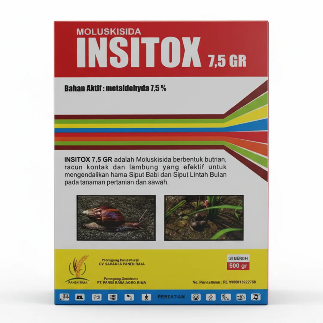 INSITOX 7,5 GR adalah solusi ampuh berbentuk butiran siap pakai yang dirancang khusus untuk memberantas hama moluska pada area pertanian dan persawahan. Berfungsi sebagai racun kontak dan lambung, produk ini efektif menghentikan serangan hama siput babi dan siput lintah bulan yang dapat merusak tanaman secara signifikan. Formulasi butiran memudahkan aplikasi tabur yang merata di sekitar area tanam.